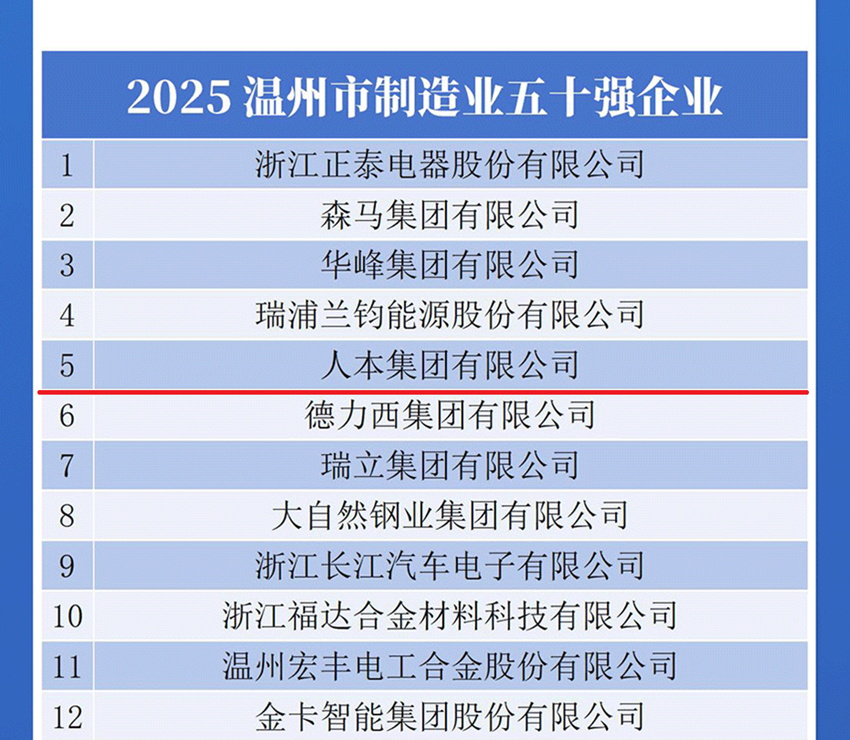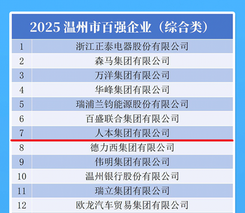 10月28日,“2025溫州市綜合百強企業”榜單正式發佈。該榜單由溫州市企業聯合會、溫州市企業家協會、溫州市工業經濟聯合會聯合評定,以2024年度企業在溫州地區的銷售收入或營業收入為主要依據,今年已是連續第21次發佈。人本集團憑藉穩健的綜合實力與持續增長的業績,在“溫州市綜合百強企業”中位列第7,在“溫州市制造業五十強企業”中排名第5,兩項排名均較去年提升一位。